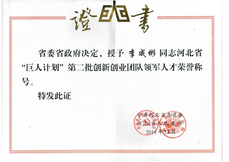 光源太陽(yáng)能董事長(zhǎng)李成彬,被授予河北省“巨人計(jì)劃”第二批創(chuàng)新創(chuàng)業(yè)團(tuán)隊(duì)領(lǐng)軍人才榮譽(yù)證書