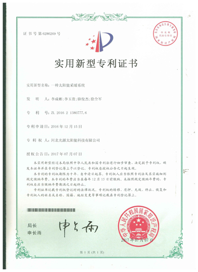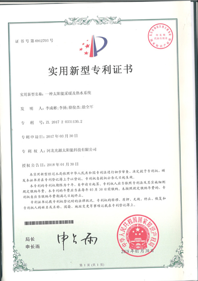 實(shí)用新型專利證書--一種太陽(yáng)能采暖系統(tǒng)