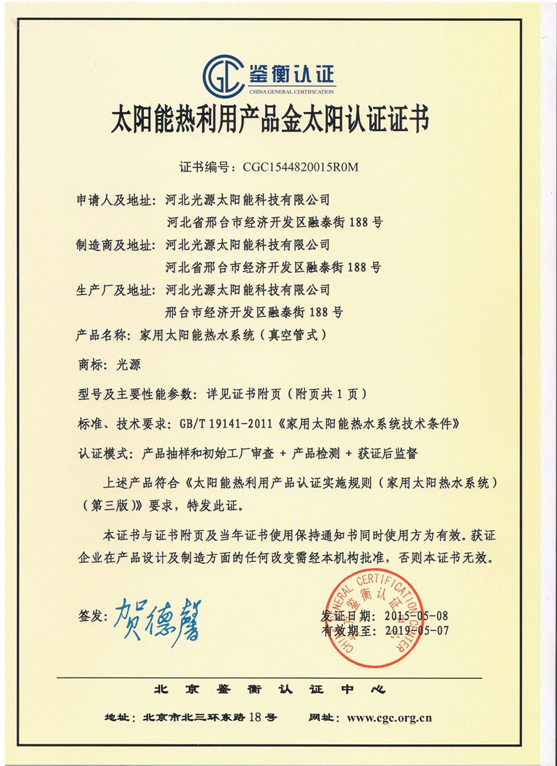 太陽能熱利用產(chǎn)品金太陽認證證書
