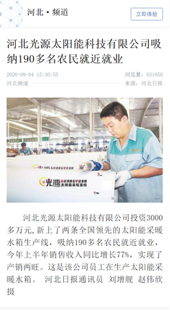 新華社報(bào)道說(shuō):“河北光源太陽(yáng)能科技有限公司投資3000多萬(wàn)元,新上了兩條全國(guó)領(lǐng)先的太陽(yáng)能采暖水箱生產(chǎn)線,吸納190多名農(nóng)民就近就業(yè),今年上半年銷售收入同比增長(zhǎng)77%,實(shí)現(xiàn)了產(chǎn)銷兩旺?!?/span>