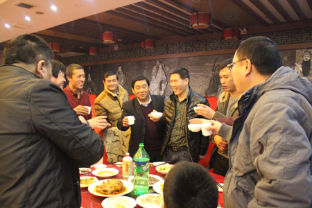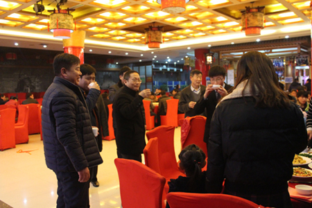 晚會(huì)結(jié)束后,春節(jié)晚宴開(kāi)始。董事長(zhǎng)李成彬、總經(jīng)理劉迎波與公司領(lǐng)導(dǎo)來(lái)到員工中間,向員工敬酒,祝賀新年。