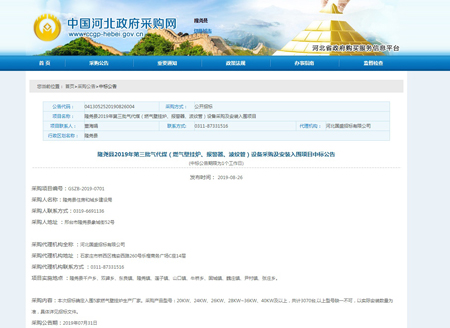 捷報頻傳, 熱烈祝賀我公司(河北光源太陽能科技有限公司)2019年08月22日中標(biāo)隆堯縣2019年第三批氣代煤(燃?xì)獗趻鞝t、報警器、波紋管)設(shè)備采購及安裝入圍項目。本次中標(biāo)又一次認(rèn)可了我公司的產(chǎn)品質(zhì)量,驗證了我公司的實力。