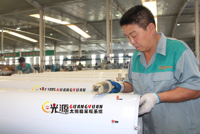 河北光源太陽能科技有限公司員工在制桶生產(chǎn)線上加班加點(diǎn)趕制太陽能采暖水箱。