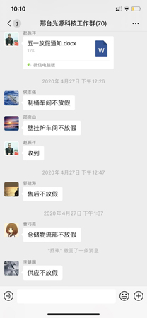 “五.一”前的4月27日,光源太陽能科技公司下發(fā)了“五.一”放假的通知。通知說:“經(jīng)公司領(lǐng)導(dǎo)研究決定,自2020年5月1日——2020年5月5日(“五.一”國際勞動(dòng)節(jié))放假五天?!?/span>