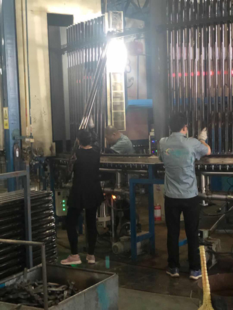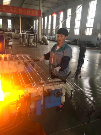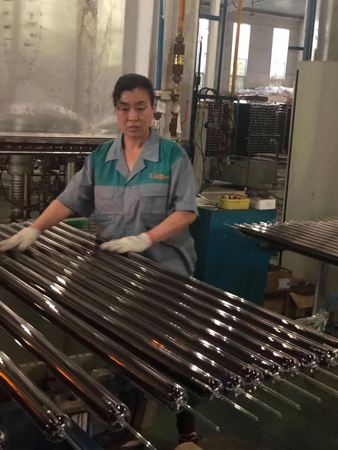 “五.一”這天,驕陽似火。室外溫度高達(dá)35度,真空管車間,在火考中作業(yè),工人們揮汗如雨戰(zhàn)高溫。他們的口號(hào)叫得響:寧流萬滴汗,不出一次品。