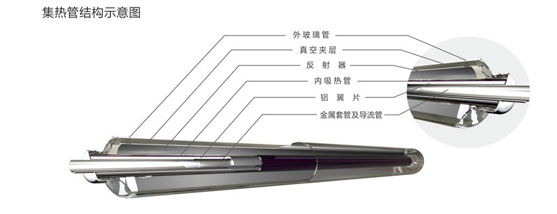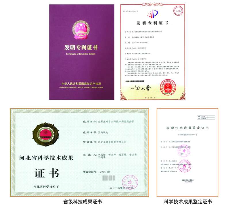 技術(shù)特點:一是內(nèi)置CPC反射器。外罩玻璃管與吸熱管采用同軸套管,在真空管內(nèi)壁下半周設(shè)置金屬拋物面反射器,運用拋物面原理實現(xiàn)了全角度采光,反射器不受大氣污染,聚光效果更好。二是耐高溫鍍膜技術(shù)。內(nèi)吸熱管表面濺射耐高溫太陽吸收膜層,內(nèi)外管之間抽真空,工作溫度400℃以上膜層不脫落、不老化。三是強制傳質(zhì)傳熱技術(shù)。在吸熱管內(nèi)插裝金屬套管,套管內(nèi)置入金屬導(dǎo)熱管,使管內(nèi)的介質(zhì)容量減少了70%,大大提高了傳質(zhì)傳熱效率。四是安全承壓技術(shù)。金屬套管與聯(lián)集箱采用絲扣連接,保證系統(tǒng)工作安全可靠。經(jīng)權(quán)威機構(gòu)檢驗,太陽能吸收比、熱損系數(shù)、真空品質(zhì)等技術(shù)指標(biāo)均優(yōu)于國家標(biāo)準。采用該產(chǎn)品組成的太陽能中高溫?zé)崂孟到y(tǒng),穩(wěn)定工作溫度可達到163℃蒸汽,真正實現(xiàn)了太陽能由“熱水應(yīng)用”到“熱能應(yīng)用”的跨越式提升,填補了國內(nèi)太陽能中高溫真空集熱管在160℃溫區(qū)的技術(shù)空白。科技成果鑒定認為:該產(chǎn)品的綜合性能達到了“國內(nèi)領(lǐng)先水平”,系統(tǒng)可廣泛用于太陽能飲用開水、采暖制冷、食品加工、紡織印染、農(nóng)副產(chǎn)品烘干等多種行業(yè)。對促進大氣污染治理,推動我國能源結(jié)構(gòu)調(diào)整具有重要意義。